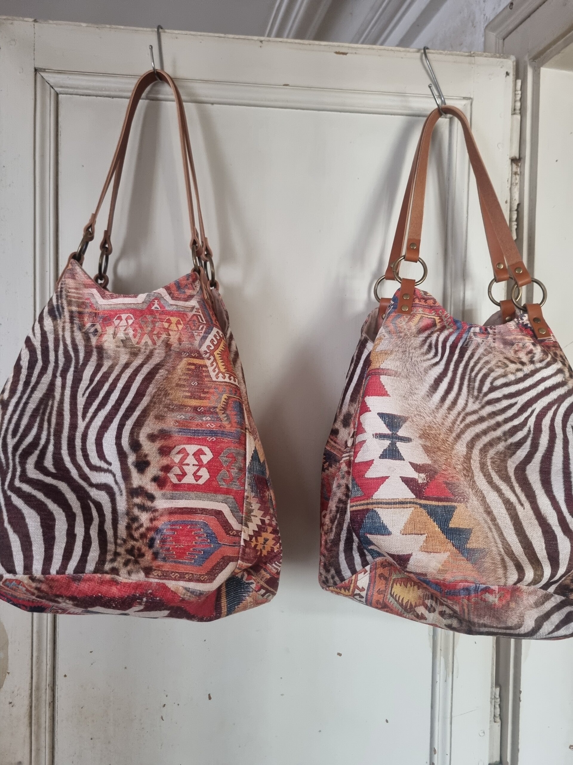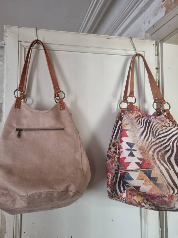 Alweer een nieuwe prachtige versie van ons topmodel tas! In een stevige kelim safari stof met beige of bruschetta kleur suedine binnenkant. De tas is reversible, zodat je eigenlijk 2 tassen hebt, ;-)!!